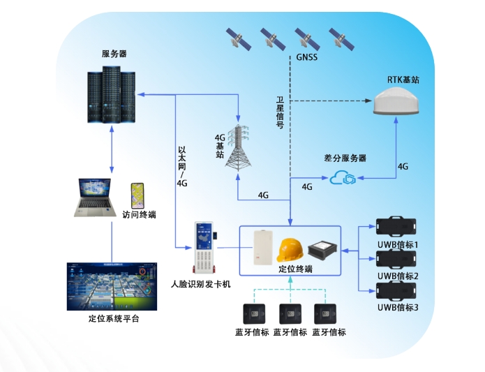 RTK+UWB+藍(lán)牙+4G融合人員定位安全管理系統(tǒng)拓?fù)鋱D:
